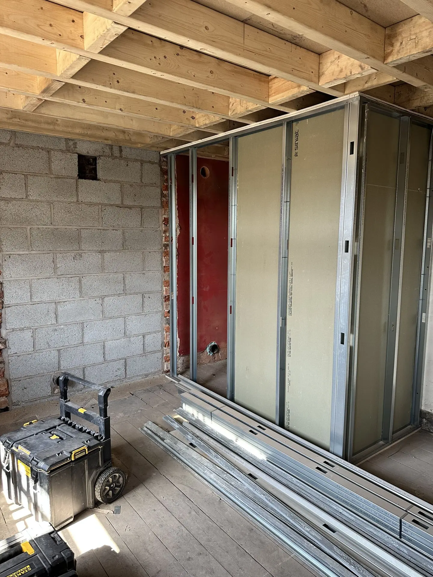 Internally, the staircase has been assembled and is ready for installation. Room partitioning continues across all floors, and boarding is due to commence shortly.